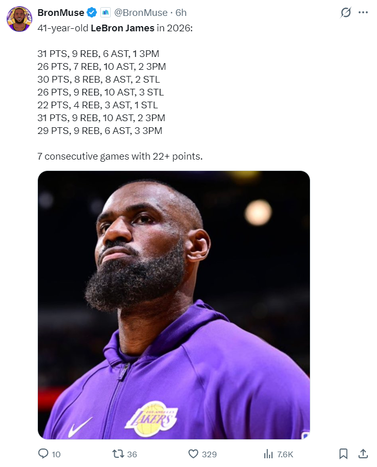 进入2026年后詹姆斯场均25+5+5领跑全联盟,这样一个41岁的老将还要背锅吗?